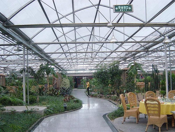 The ecological restaurant constructed by Qingzhou Haoyang Greenhouse Engineering Co., Ltd. overcame the disadvantage for easy condensation and small view in the planting greenhouse, designed and developed the high-ridge, large-span and large-space special type on the concept of large space, comfort and environmental protection. The coverage materials apply the glass or PC plate. The appearance is grand with the beautiful modeling, while the inside is wide and bright with broad vision. In the ecological restaurant, you could not only feel the pastoral flavor, could also enjoy the delicious foods.