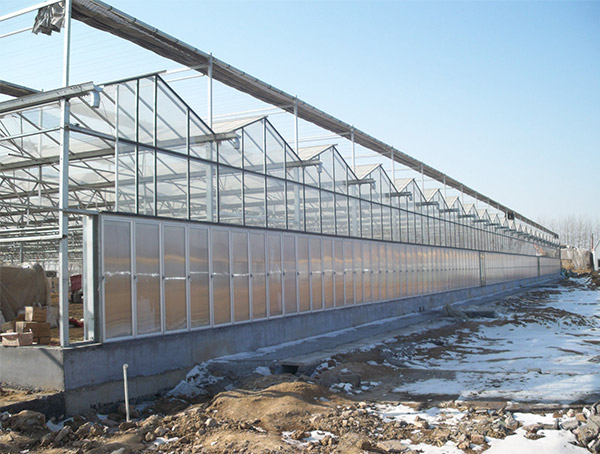 頂部覆蓋采用防紫外線防結(jié)露聚碳酸酯中空板,四周墻體按常規(guī)要求為聚碳酸脂中空板或采用玻璃,根據(jù)地區(qū)氣候條件的差異,在一些寒冷地區(qū)(如吉林、黑龍江等地),北墻體可采用保溫復(fù)合板,還可以安裝推拉窗,增加溫室通風(fēng)面積。